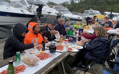 Tradisjonen tro var det så reker og pølser til alle og det kunne se ut som om de 49 frammøtte koste seg ved langbordet i duskregnet.